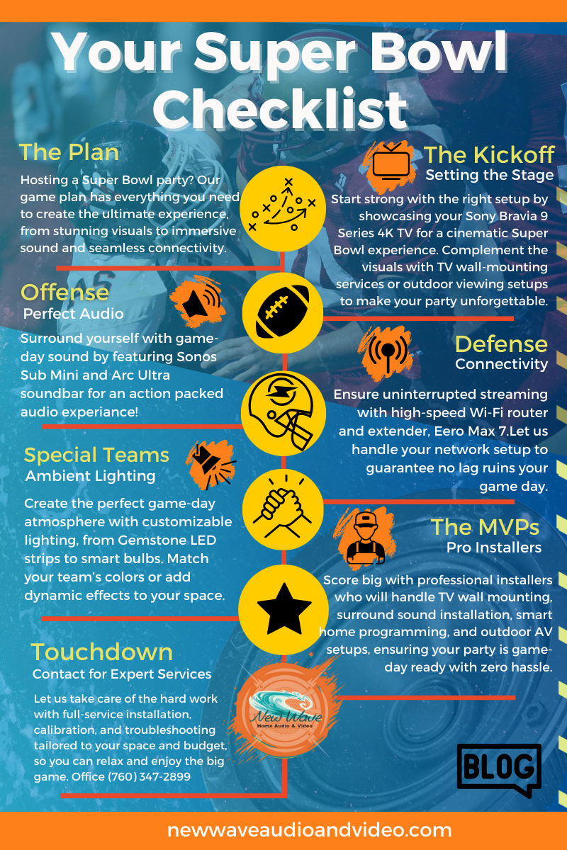 For football lovers, the Super Bowl is more than a game; it’s the event that unites fans, friends, and family for an unforgettable experience. At New Wave Home Audio and Video in Indio, Coachella Valley, we know how important it is to make your Super Bowl viewing party truly special. That's why we offer top-of-the-line audio and video products and services that will make your home feel like the ultimate game-day stadium.